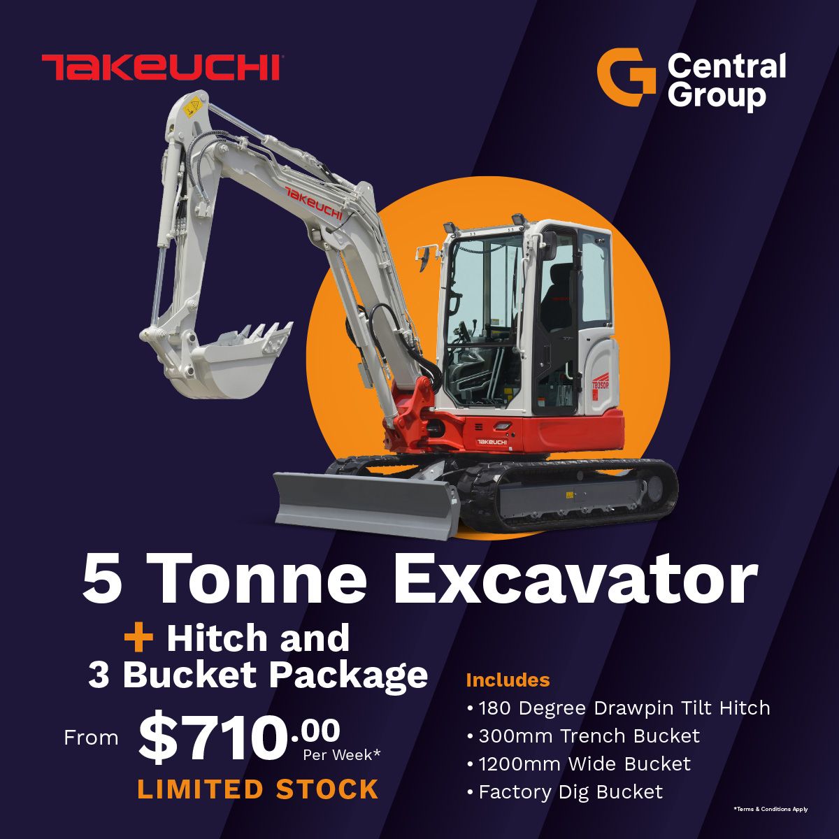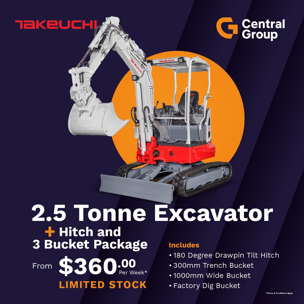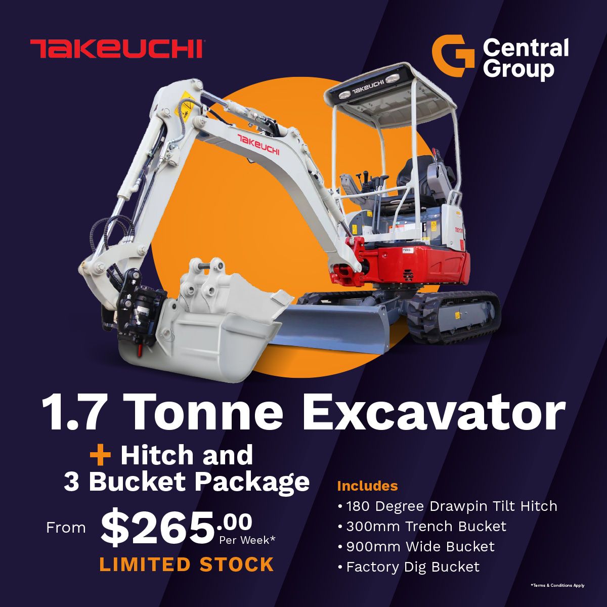 Finance terms and conditions apply – The 2.99% p.a. fixed interest rate offer is available on Takeuchi TB325R Standard model packages purchased at participating Central Group branches only. A minimum 6-month and maximum 36-month loan term is available. A 15% deposit (based on the GST exclusive price) is required. A $460 UDC loan establishment fee and a $10.35 PPSR fee will apply. This offer is not available in conjunction with any other finance offer, promotion or discount. The offer is valid from 8 February 2026 to 31 March 2026 (inclusive) or while stocks last. Approvals are subject to responsible lending inquiries. UDC’s loan eligibility criteria, fees, terms and conditions apply.