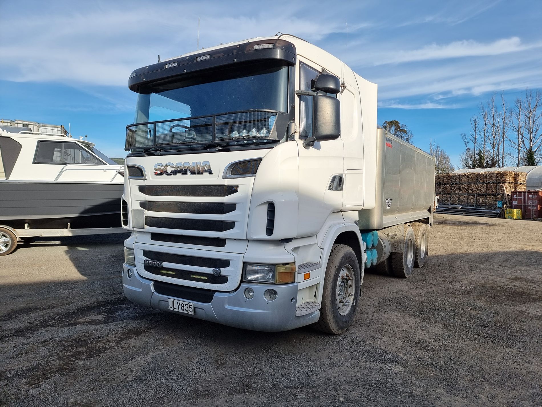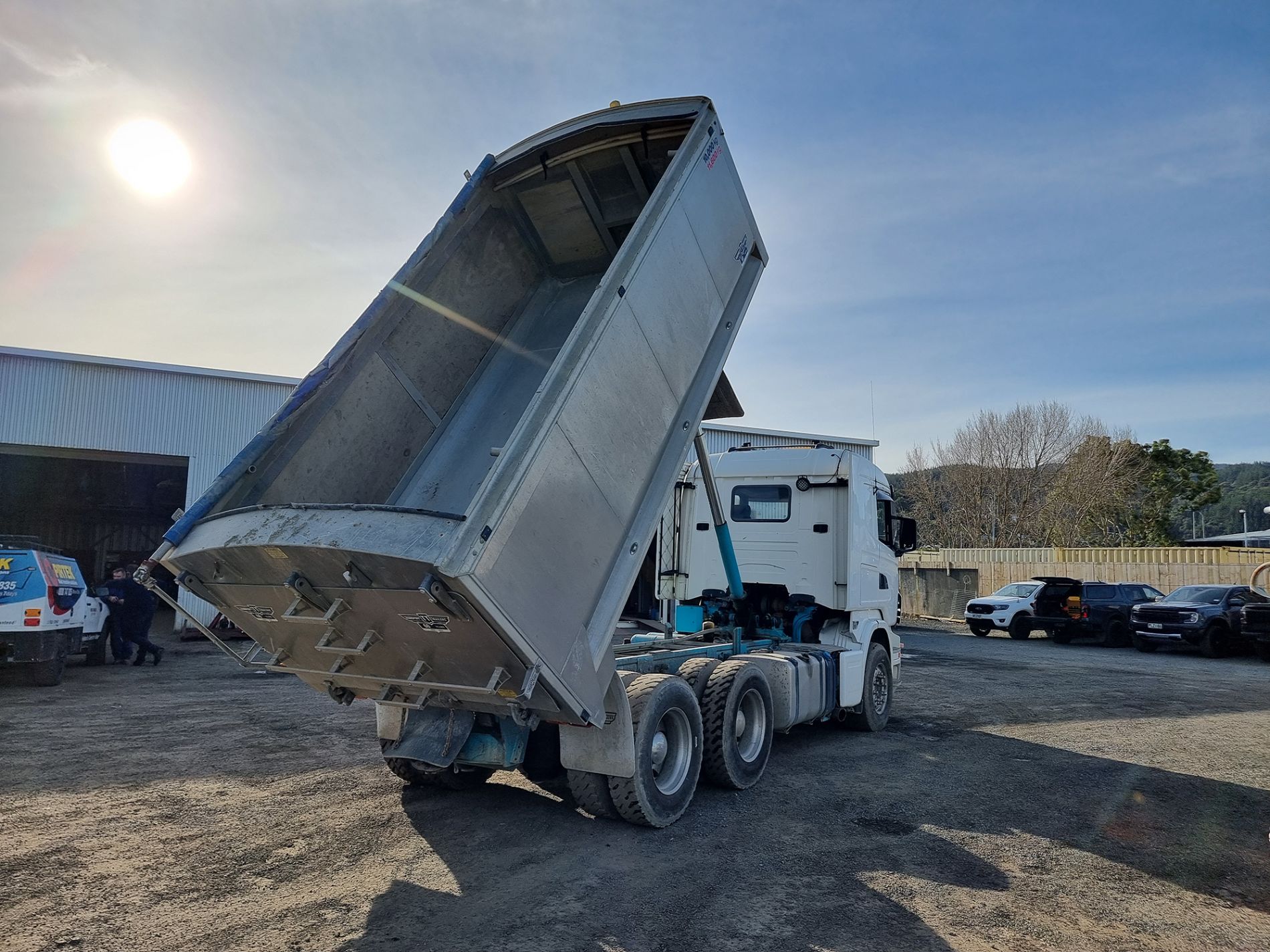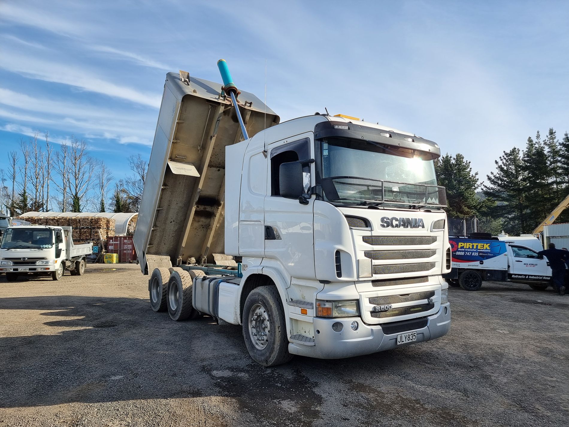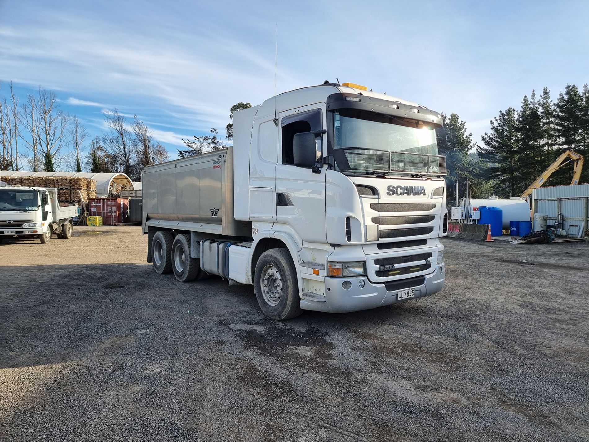 the truck comes complete with transport trailers aluminium bulky tipping body, top hinge gate, air bag rear suspension, 50mm ring feeder with trailer hydraulics.