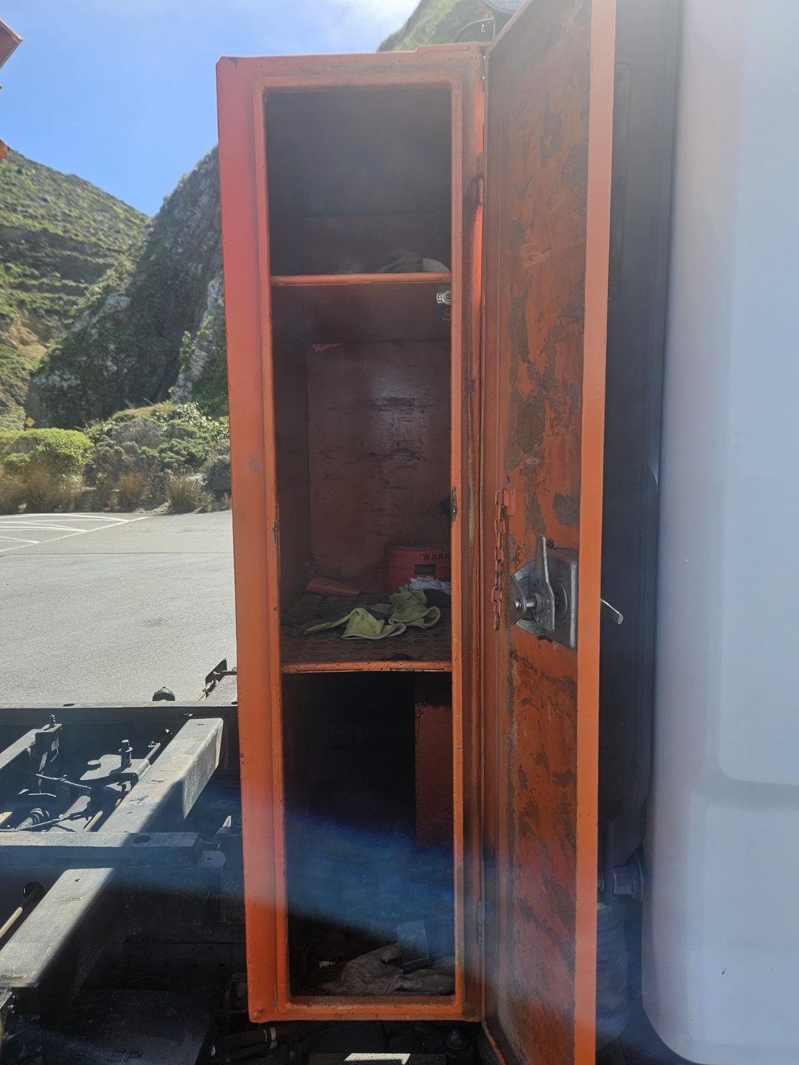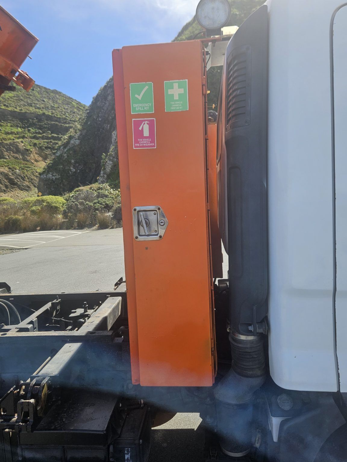 Bin has 2 way swinging tail gate, internal ties, deck lock out, under deck certified hooks, 2x headboard mounted work lights, high headboard with tool locker.